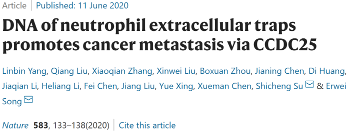 2020 年 6 月 11 日,中山大学中山医学院宋尔卫院士、苏士成教授团队在 Nature 上在线发表了题为 DNA of neutrophil extracellular traps promotes cancer metastasis via CCDC25 的研究成果 (6)。该研究发现 肿瘤细胞膜上的蛋白 CCDC25 可作为 NET-DNA 受体感知胞外 DNA,进而介导肿瘤转移的发生;监测血液样本中的 NET-DNA 可能作为评估肿瘤患者预后的一种方法。