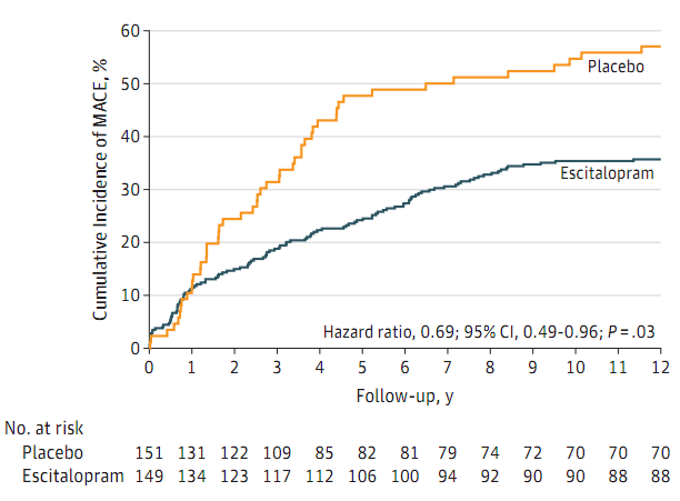 ➤艾司西酞普兰组有40.9%的参与者发生了主要不良心脏事件,安慰剂组为53.6%(HR = 0.69; 95% CI, 0.49-0.96; P = .03);