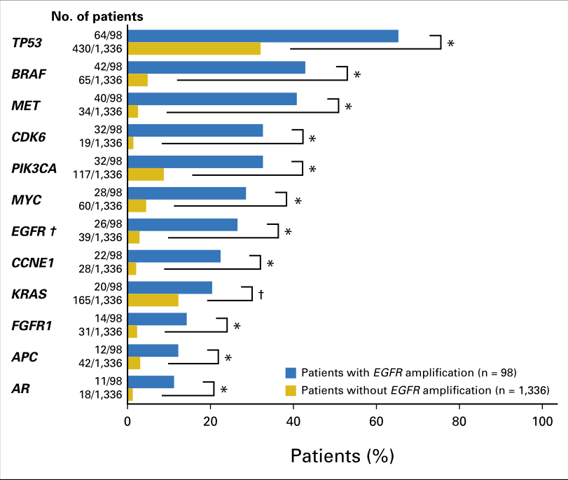 在UCSD队列,有EGFR扩增的患者(n=98)出现其他基因突变的比例明显高于无EGFR扩增的患者,说明EGFR扩增患者更有可能伴随着多通路激活。