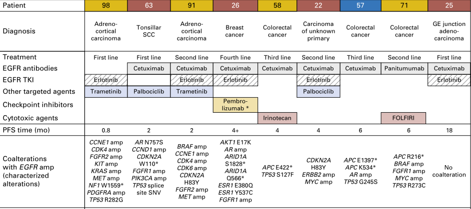 在98例EGFR扩增患者中有9例使用了抗EGFR方案治疗,包括扁桃体鳞状细胞癌、三阴乳腺癌、不明原发灶的腺癌、胃食管交界处腺癌、肾上腺皮质癌和结直肠癌。