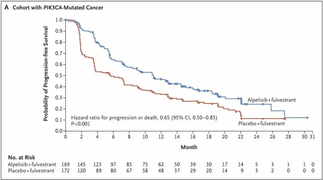 试验结果表明,在PIK3CA突变队列中,Alpelisib+氟维司群组对比氟维司群单药组,显著延长患者PFS,mPFS分别为11.0个月和5.7个月(HR=0.65;95%CI 0.50~0.85;P=0.00065)。