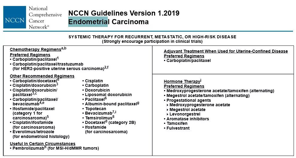 2019子宫肿瘤NCCN指南中,推荐子宫内膜癌的治疗涉及HER2阳性使用抗ERBB2抗体;激素治疗、依维莫司、免疫治疗(帕博利珠单抗,仅限MSI-H)。