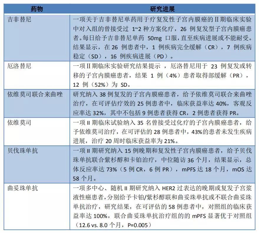3.Jasas KV, et al. Phase Ⅱ study of erlotinib (OSI 774) in women with recurrent or metastatic endometrial cancer: NCIC CTG IND-148 . J Clin Oncol, 2004,22(suppl): 453-453.Slomovitz BM, et al. 4.Phase II study of everolimus and letrozole in patients with recurrent endometrial carcinoma. J Clin Oncol. 2015 Mar 10;33(8):930-6.