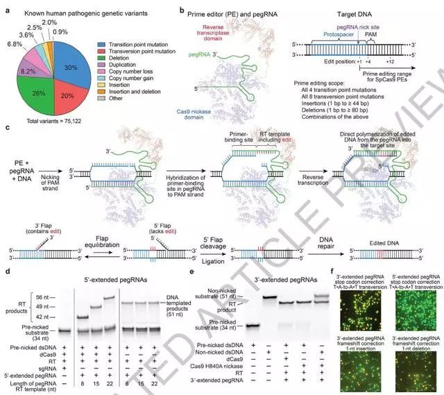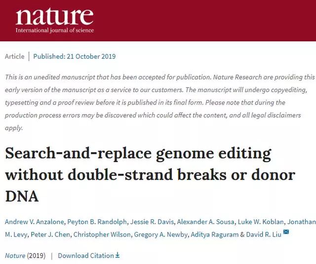 2019年10月21日,博德研究所David Liu团队在Nature 在线发表题为”Search-and-replace genome editing without double-strand breaks or donor DNA“的研究论文,该研究描述了Prime编辑,这是一种通用且精确的基因组编辑方法,它使用融合了工程逆转录酶的催化受损的Cas9,将新的遗传信息直接写入指定的DNA位点,并使用Prime编辑向导RNA(pegRNA)进行编辑。