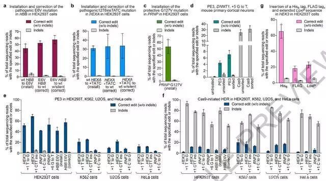 与已知的Cas9脱靶基因座相比,Prime编辑提供的脱靶活性远低于Cas9,与Cas9引起的HDR相比,副产物少得多,效率更高或相似,并且与碱基编辑器相比具有互补的优势和劣势。通过无需DSB或供体DNA模板即可进行精确的靶向插入,缺失和所有12种可能的点突变类别,Prime编辑具有促进绝大多数致病等位基因研究和校正的潜力。